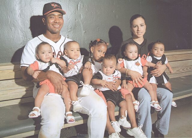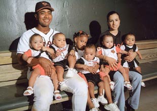Mora Quintuplets Get Major League Treatment Thanks to ShowerBaby®Baltimore Orioles' Leadoff Hitter Pitches In at Bath Time"Until we got the ShowerBaby, Melvin just couldn't bathe the babies," said Gisel Mora, Melvin's wife and one of fewer than 400 women in the world ever to give birth to quintuplets. "He's so big and strong, you just don't think of a world-class athlete being afraid to do anything. But accidents can happen so quickly to babies in the bathroom. Now that we have the ShowerBaby, Melvin loves to bathe the babies, and they love it too." When it's bath time for Christian, Matthew, Rebekah, Jada, and Genesis, the ShowerBaby® table is pulled down from its out-of-the-way resting position. In turn, each baby is secured on the soft, inclined surface with a coated safety belt, so there is no danger of the baby getting off the table. Using a spray wand that is attached to the faucet, Melvin or Gisel washes each baby clean with warm water. The soapy water drains through a tube right into the toilet. The surface stays clean and there is no standing water. "My babies are so important to me," says Melvin. "Unless I am on the field, I am thinking about them. It's hard to be away from them for so long when we are on the road. But now when I'm home I can do more to help take care of them, just like every good father wants to. It's not just to help Gisel, it's really to be the best father I can be." According to Gisel, the babies are just as happy about the ShowerBaby® as their parents. "Christian is the most active of the five. But he lays still on the ShowerBaby and loves to be pampered with the water from the spray wand. "Rebekah is pretty funny. As soon as you sit her in the ShowerBaby and she sees the wand go on, she opens her mouth so you can shoot the water in it. She just keeps her mouth open and lets the water run out. She does it until bath time is over "Matthew is pretty solid. He has a lot of strength. During his bath, he likes to sit on the ShowerBaby and bounce on it. He's also very ticklish, so I use the trigger on the spray wand to shoot streams of water at his different ticklish spots. He has so much fun it's just adorable to watch him enjoy his bath. "Genesis and Jada have special needs. They are fed via G-Tube. Keeping them clean was very uncomfortable for them when we had to rub the area around the tubes with a washcloth. ShowerBaby makes cleaning a lot easier for us and a lot more comfortable for them." ShowerBaby® can also be used as a changing table. In addition to making changing time more relaxing for parent and child, ShowerBaby® dramatically reduces the need for chemically treated wipes and helps prevent diaper rash. "Whenever one of the babies has a big mess, we head right for the ShowerBaby," adds Gisel. "There's no worry about the mess going everywhere. And since the table gets washed off with the wand and everything goes into the toilet, it's the perfect solution to what used to be a big problem." Now,